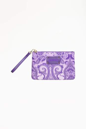 4GIVENESS Pochette Capri cote d'azur lilla da donna. Questa pochette presenta una vivace fantasia paisley. Il design è elegante e moderno, con un grande logo "4GIVENESS" in rilievo su un'etichetta in pelle viola sulla parte frontale, arricchita da borchie dorate per un tocco di raffinatezza. La pochette è dotata di una tracolla sottile, anch'essa viola, che aggiunge praticità e comodità. La chiusura con zip assicura la sicurezza degli oggetti all'interno, rendendo questa pochette ideale per eventi o per un uso quotidiano più casual ma stiloso. Dimensioni: 29 x 20 centimetri. Stagione primavera estate.Codice