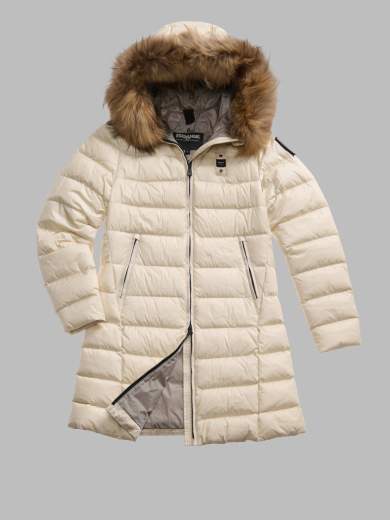 Piumino donna blauer Kristin lucido lungo trapuntato a righe orizzontali con cappuccio fisso, bordo in pelliccia removibile ed interno in contrasto colore. Capo donna con colori fashion e dal taglio che risalta il punto vita.• Cappuccio fisso