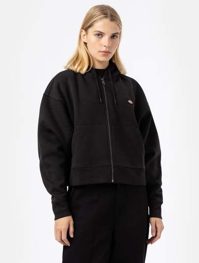Felpa donna dickies con cappuccio e zip Oakport realizzata in morbidissimo pile di policotone spazzolatotasche a marsupio per gli oggetti essenziali iconica etichetta dickies ricamata sul petto