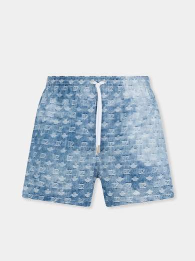DSQUARED2 Shorts mare blu da uomo dal design moderno e distintivo, caratterizzato da una stampa monogram all-over su base effetto denim. Un capo che unisce estetica urbana e spirito estivo, perfetto per uno stile ricercato anche in spiaggia. Realizzato in tessuto tecnico leggero e ad asciugatura rapida, garantisce comfort e praticità durante tutta la giornata. La vita elasticizzata con coulisse regolabile assicura una vestibilità personalizzata, mentre il taglio corto dona un look contemporaneo e dinamico. Il modello indossa una taglia 48 ed è alto 187cm. Si consiglia un lavaggio a mano. Stagione primavera estate.Codice