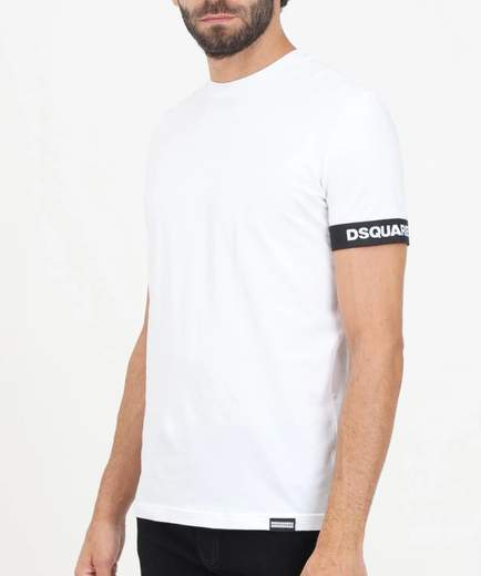 DSQUARED2 T-shirt a manica corta da uomo. Realizzata in cotone leggero ed elasticizzato, presenta una vestibilità slim che valorizza la silhouette. Il dettaglio distintivo è la stampa bianca con lettering logo posizionata sulla manica, che aggiunge un tocco streetwear al capo. Il modello indossa una taglia L ed è alto 187cm. Si consiglia un lavaggio ed una stiratura a media temperatura. Stagione primavera estateCodice