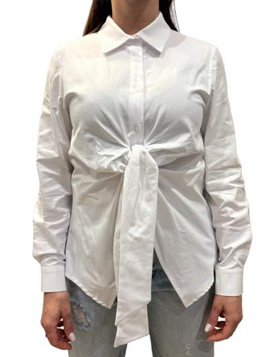 Camicia bianca donna kontatto modello over, colletto classico, manica lunga, fondo con punte e dettaglio nodo davanti, dietro con piega. Vestibilità ampia.Codice