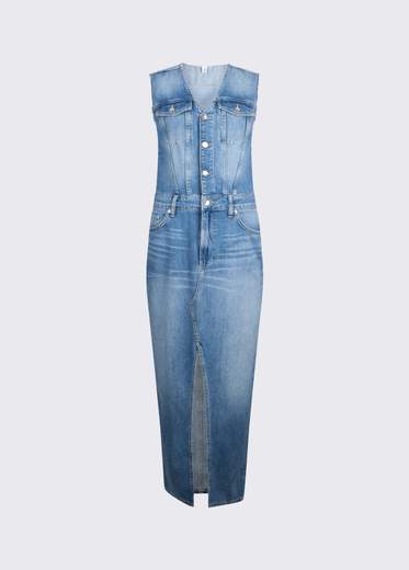 Abito donna liu jo lungo in denim no-stretch e lavaggio stonewash con baffi e graffiature con scollo a V e maniche con orli unfinishedComode tasche bottoni logati con spacchetto frontale
