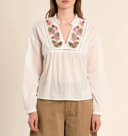 Camicetta donna molly braken con ricami floreali - Scollo a V con ricami - Maniche lunghe con polsini abbottonati - Taglio dritto -Codice